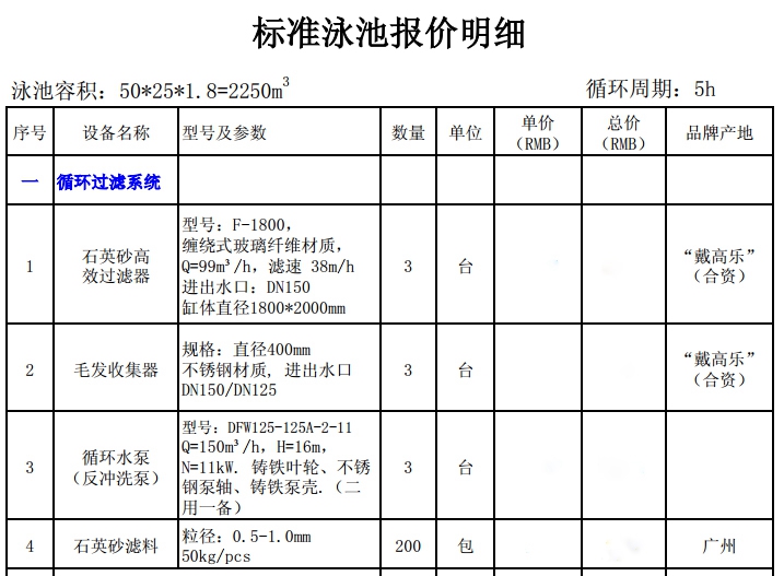 案例:泳池容積為50*25*1.8m=2250m3,循環(huán)周期為5h/次。