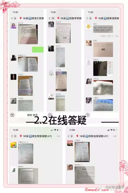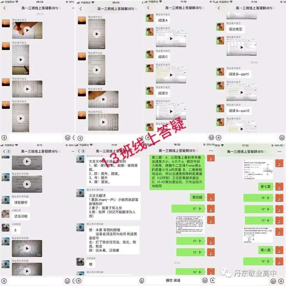 教師們?cè)诰W(wǎng)課直播期間,不但主動(dòng)上網(wǎng)進(jìn)行觀課,而且在各班組建的答疑群里實(shí)時(shí)給予學(xué)生作業(yè)方面的指導(dǎo)。老師們運(yùn)用了語(yǔ)音、視頻、文字、圖片等多種溝通方式,突破了時(shí)空限制,很好的解決了學(xué)生的學(xué)習(xí)障礙。